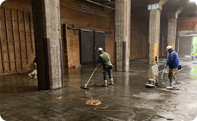 物流倉庫に貯蔵されていた食材のニオイが充満したことで、壁・床などに強烈に悪臭が染みついていました。これでは次の荷物を受け取り、保管をすることは無理…。強アルカリイオン電解水の噴霧と、オゾン燻蒸脱臭の作業を、約14日間行うことで、不快なニオイを感じない状態となり問題解決。倉庫は再び稼働しました。